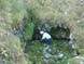 Doline d'environ 3 x 5 mètres de section, dont le pourtour a encore des restes d'une vieille barrière en fil barbelé. Le fond à -3m est couvert de blocs moussus : du côté sud, une niche encombrée de blocs et de déchets descend à -5m, alors que du côté nord, une fissure exhalant un fort courant d'air incite à la suivre. Après quelques mètres de ramping, on débouche dans une petite salle ébouleuse surmontée d'une cheminée, tandis que sol est crevé par un orifice entre les blocs. |
