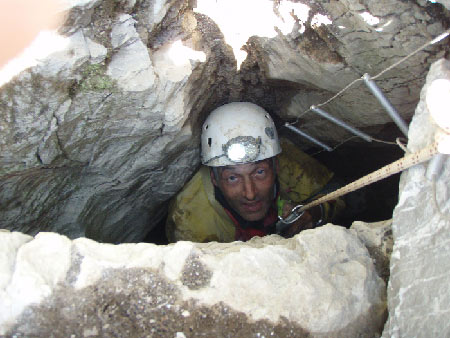 Petit orifice qui a été désobstrué et donnant sur un puits étroit axé sur une fracture de lapiaz. Il a été découvert grâce a une doline ouverte dans la neige par le courant d'air. |