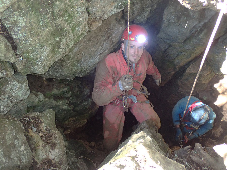 Arrêt sur une fissure impénétrable estimée à 3-4 m de profondeur (mais propre !). Pour la prochaine séance, il faudra élargir afin de pouvoir faire passer le tonneau. Au bas, on approche des 30 m de profondeur …