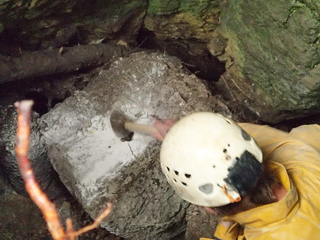 Evelyne, Mario, Philippe et Jack + Denis, Caroline et Ludovic de la SSGLors de la dernière sortie au mois de septembre (Hervé et Marc), deux gros blocs avaient été détachés d'une niche sous l'entrée mais ensuite impossible de les briser avec la masse afin de les sortir.Nos amis genevois viennent donc nous donner un coup de main en nous faisant une démonstration d'utilisation des éclateurs de roche.Y'a pas à dire, c'est vraiment très efficace et les débris de ces deux gros blocs peuvent alors être ressortis.Démonstration avec éclateur de roche Denis et Ludo au travail