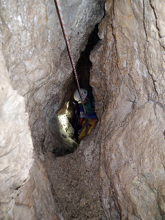 Après désobstruction, la fissure de 10 cm a fait place a un méandre pentu