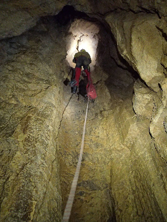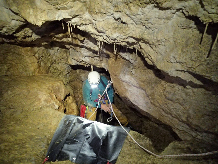 De retour cette fois pour poursuivre l’exploration, un deuxième petit puits est équipé. Comme le départ est recouvert d’une bonne couche d’argile et de mondmilch, et pour ne pas trop dégueulasser la perceuse, une bâche est posée afin d’aller poser un goujon de fractionnement 2 m plus bas, mais à la base du puits ça se termine malheureusement vers -20m par une petite niche suivie d’une fissure impénétrable.Equipement du deuxième puits