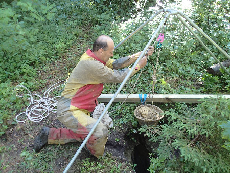 Poursuite des désobstructions dans cette baume dont l’entrée, en hiver, est dégagée par le courant d’air. Le tripode fabriqué par Hervé facilite la remontée des bidons, mais il faut encore de l’huile de coude pour les tirer !Le départ du puits