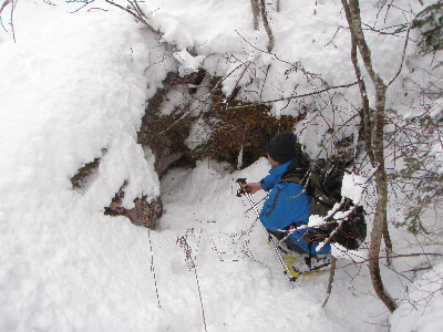 Quelques fissures et petits trous ouverts dans la neige sont repérés mais il faudra revenir en été pour désober un peu et voir si c’est vraiment intéressant.Un petit trou à revoir