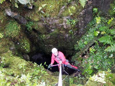 Là c’est une grosse surprise car le gros névé (250-300 m3) a complètement disparu et après la partie d’entrée, le P9 qui suivait est maintenant un beau P18. Conséquence : le tunnel désobstrué et donnant sur le puits parallèle n’est plus atteignable sans un grand pendule. Au bas du P18, il n’y a malheureusement pas de suite.Fractio sur un spit de 1988 !