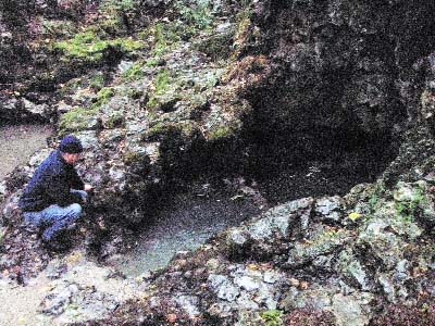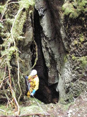 Deux goujons plus tard (là aucun spits n’avait été posés !) on est au fond pour constater que le névé et le plancher de glace n’est plus qu’un souvenir. Toutefois, pas de suite évidente mais un courant d’air dans le bouchon d’humus et de branchages laisse supposer que ça pourrait continuer … après une grosse désobstruction !Après quoi on va au Gouffre no.1 des Croix-Rouges où on constate que le névé a pris un sérieux coup de vieux mais comme il est situé juste au dessus d’une cheminée du Gouffre no.2 cet objectif est moins intéressant.On se rend donc ensuite à la Glacière no.1 du Couchant.Marc à l’entrée