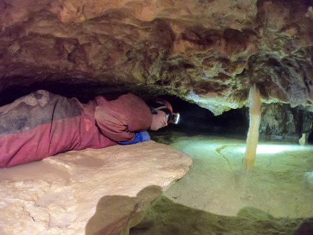 Après avoir laissé une partie du groupe entamer le ramping vers la sortie nous allons vite voir le petit lac à côté du départ de l’étroiture avec Vivien et Alessio. Arrivée dehors vers 14h après avoir passé 3h sous terre avec Christian qui nous attend à la sortie. Vivien a fermé le pas puisque c’est lui qui fermera la porte. Au vu des grommèlements qu’a lâchés le président la fermeture a l’air d’’être plus compliqué que l’ouverture ! Petit conseil de Christian : amener un gaucher avec soit. Cette magnifique sortie nous auras finalement permis de prendre de beaux clichés en plus de profiter de la beauté qui se cache sous nos pieds.Photo par Jonas : petit lac au début de la grotte après le ramping