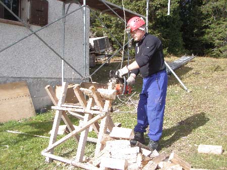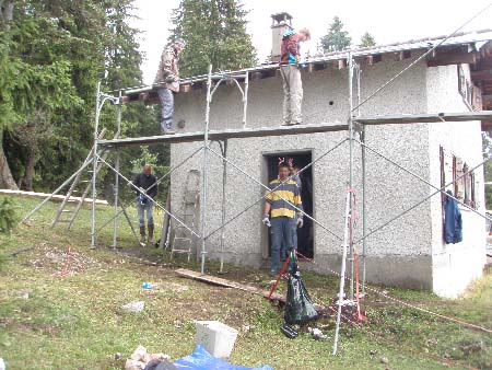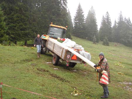 Transport des échafaudages, mais cette fois Maurice a pu monté jusqu’au chalet car il a pris un tracteur 4×4