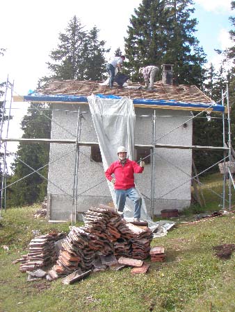 Démontage de l’ancien toit : Claude-Alain à la réception des tuiles