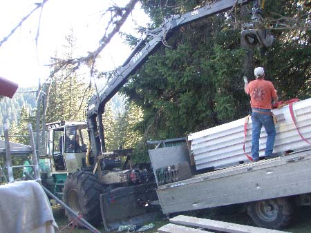 Pose du nouveau toit : Corinne à la manoeuvre avec le tracteur de débardage