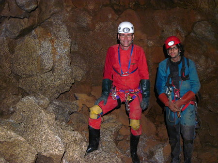 On fera demi tour après un peu plus de 3 heures de progression, à contre cœur, pour être certain de sortir avant que Philippe ne s’inquiète.Jour 4 : Lundi 24/04/2019Anna + Philippe + Felix* :On décide de faire une grotte facile, horizontale, et qui contiendrait de l’aragonite : Su Prediargiu. D’après le « cadasto » sarde (une sorte d’inventaire public des grottes), la grotte n’est pas fermée. Pourtant, en arrivant à l’entrée, on a eut la mauvaise surprise de la voire barrée et cadenassée. Du coup, nous sommes allé repérer les entrées de deux autres grottes pour les jours suivants.Jour 5 : Mardi 25/04/2019Anna + Philippe + Félix* : Nous allons visiter la grotte Gutturu ‘e Murgulavò. Anna équipe. La zone d’entrée est assez étroite, avec notamment un tout petit bout de « méandre » très étroit et accrocheur où Philippe déchire sa combi, avant qu’on ne passe en enlevant notre baudrier (seul Anna passée la première l’a gardé). S’en suit une tête de puit bien pénible car étroite et avec le seul passage eu poil plus large un peu décalé : du coup Philippe doit tirer Anna de la tête de puit pour la libérer, afin qu’elle puisse recommencer en se décalant cette fois-ci.Une fois cette zone d’entrée exigeante passée, on arrive rapidement dans la galerie principale, et là, le paysage change complètement : On passe de passages étroits et glaiseux à une galerie de belles dimensions, avec un petit actif et d’innombrables concrétions. Mais si les concrétions sont magnifiques, ce qui fait de cette grotte un exemplaire quasi unique est le fait que cette galerie principale développe dans du granit ! Oui, vous avez bien lu, du granite, cette roche usuellement très dure et pas du tout propice aux grottes. Sauf que là, non seulement le sol est en granite, mais aussi les murs et le plafond ! Il s’agit surtout de gros blocs conglomérés et maintenus par les coulées de calcite. Et chose surprenante (et un peu inquiétante) : si certains cailloux de granite sont durs comme il se doit, d’autres en revanches sont extrêmement friable (si un jour on vous met au défit de broyer un bloc de granite de la taille d’une pomme à main nu, vous pouvez accepter sans hésiter : si vous choisissez bien votre cailloux, vous pouvez le réduire en sable plus facilement que vous ne presseriez un citron).Les blocs de granite, recouvert d’un peu de calcite (la couche granitique se trouve sous une épaisseur de calcaire) :