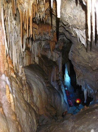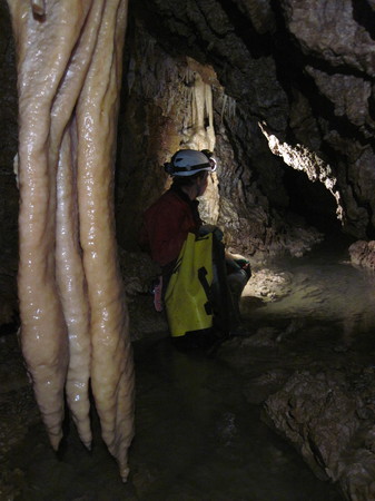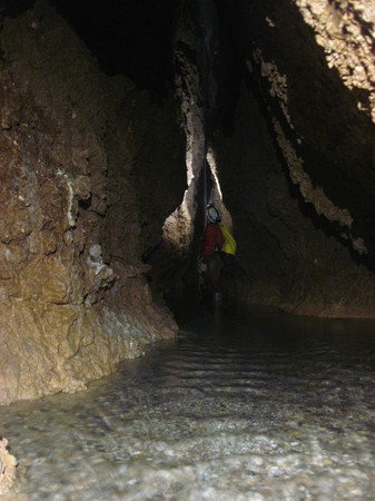 Philippe : randonnéeNicoleta + Felix* : Grotte de DoniniD’après les informations d’Anna et de Thomas, la grotte aquatique de Domini était vraiment facile et très intéressante. De plus, elle est équipée pour le congrès (y compris le « saut » de 3m), et il y a des cordes en place pour sortir par l’échappatoire (au lieux de descendre en rappel la cascade de 50m et de poursuivre dans le canyon, on remonte sur le côté). Bref, on se laisse convaincre de faire la grotte. Vue qu’ils annoncent de la pluie, on est quand même un peu hésitant, du coup on fait le détour par le congrès, ou on nous assure qu’il faut beaucoup plus de pluie pour que ce soit un problème.Anna et Thomas avaient mis 3 heures pour faire la grotte. Du coup avec Nicoletta, on décide de fixer l’heure pour les secours à 8h après notre départ du parking. On met un peu de temps pour trouver l’entrée, puis on fait tranquillement la grotte (belle rivière souterraine, avec de jolis gours et concrétions), perdant un peu de temps à chercher notre chemin. En sortant de la grotte, on prends notre temps pour se changer et manger un peu. Puis on suit une vague sente à flanc de montagne, qui est rapidement complété par de vagues kerns (parfois une seule pierre posée sur un rocher). Celle-ci se trouve environ à mi hauteur entre le fond du canyon et le haut des falaises (bien escarpées). Le sentier semble mener vers une des rares faiblesses dans la falaise, donc nous le suivant avec espoir (notre but est d’atteindre le sommet des falaises où passe un chemin de randonné qui nous ramènerait vers la voiture). On finit par atteindre la brèche, qui malheureusement ne mène pas tout en haut de la falaise comme ça en donnait l’air d’en bas. On continue à suivre le sentier (qui certes s’écarte du parking, mais semble monter doucement en moyenne). Celui-ci devient de plus en plus étroit et escarpé, jusqu’à ce qu’on atteigne un endroit qu’on juge trop dangereux. On remarque alors quelques voies d’escalades ! Ces kerns qu’on suivait depuis près de 2 heures menaient en fait à un site d’escalade et non pas à la sortie de la gorge ! On fait donc demi-tour, assez désemparé (sans compter que le téléphone ne passe pas, donc on ne peut même pas avertir les autres, et notre stock d’eau est quasi réduit à néant). Sur le retour vers la grotte, on aperçoit un vague embranchement qu’on avait raté à l’aller : la nouvelle sente semble retourner dans la direction de la grotte, mais en montant vers une autre brèche. On la suit, pour finir par trouver un accès au plateau, au prix de l’escalade d’une longue pente rocheuse (escalade facile mais sans assurage). On finit par rejoindre la voiture puis un endroit avec du réseau pour avertir les autres qu’on est « bien » sortis. Il était grand temps : 30 minutes de plus, et ils déclenchaient les secours !Jour 9 : samedi 29/04/2019Philippe + Thomas : balladeAnna+Nicoleta+Felix*Nous nous rendons au congrès pour récupérer la clef pour Su Palu. On y apprend qu’on fera partie d’une groupe de 13 spéléos, et qu’un autre groupe de 17 spéléos rentrera un peu plus tard. Au final, la personne qui a la clef pour le premier groupe décide que faire de gros groupes comme ça c’est absurde, et décide de juste laisser la clef en place et que chaque petit groupe entre et sort quand il veut. Au final 54 spéléos visiteront la grotte ce jour là, mais on n’en croise qu’une petite partie.C’est une belle grotte, avec 3 puits obliques pas très large au début, un bout de galerie, puis une étroiture à moitié remplie d’eau. Un groupe d’italiens décide de passer en slip, nous préférons mouiller notre combi et sous combi (ça fait limite du bien tellement la grotte est chaude). On arrive ensuite sur l’actif, un haut méandre avec de l’eau arrivant en général entre le haut des bottes et les genoux, qu’on suivra jusqu’à un énorme lac (la seule exception étant un long contournement de 2 cascades qui se fait en hauteur).Le méandre actif :