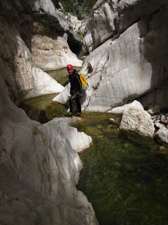 A mes yeux la meilleur grotte qu’on ait visitée : à conseiller vivement.Le soir, Thomas nous rejoint.Jour 6 : mercredi 26/04/2019Anna* + Thomas : Grotte de Donini + Canyon d’Orbisi. Une grotte très aquatique (nage obligatoire sur 1/3 du parcours) qui peut se faire en traversée en mode canyon : entrée en bordure d’un canyon (à sec), grotte aquatique, avant de ressortir en pleine falaise par une cascade de 50m. On descend en rappel le majestueux C50 qui, après une désescalade, donne sur le canyon d’Orbisi. Celui-ci est en grande partie à sec en surface, l’eau coulant sous terre. Il reste néanmoins de nombreuses trous d’eau. Au niveau de la résurgence des eaux de Donini (quasi invisible), nous quittons le canyon par un sentier bien raide. Philippe + Felix* : Philippe n’étant pas particulièrement motivé par cette grotte, il n’a même pas emmené la néoprène. Pour ma part, j’étais assez motivé, jusqu’à regarder de plus près la topo (de type canyon), et de voir qu’il y avait pas mal de nage, et surtout un saut de 3m dont il n’était pas clair s’il était facultatif ou pas. Du coup, nous avons fait une journée archéologique, en visitant d’abord le village préhistorique de Tiscali (bâtit dans un énorme mélange entre une doline et une grotte), puis un second site préhistorique en plaine.Jour 7 : jeudi 27/04/2019Anna* + Thomas : grande journée canyon: Flumineddu+GorropuNos amis nous emmènent au début du sentier qui mène à Flumineddu. De cette façon, nous pouvons laisser une seule voiture à la sortie du canyon. L’environnement est majestueux, le canyon est sec avec quelques baignades obligatoires dans des vasques froids (nous avons le néoprène pour la partie « humide »), parfois le lit du fleuve est large, parfois plus étroit et les parois rocheuses l’entourant sont alors plus imposantes. Nous apprécions la tranquillité de la randonnée, de la descente en rappel et des désescalades, ne rencontrant qu’occasionnellement quelques rares touristes randonnant dans les sections non techniques.Une fois la majeure partie de la journée écoulée, nous atteignons l’attraction principale de ce canyon : la partie aussi connue sous le nom des Gorges du Gorropu. Spectaculaire « porte » constituée par un rapprochement des parois rocheuses. C’est ce que la plupart des touristes sont venus voir, et comme ce point peut être atteint par de nombreux sentiers de randonnée ou de 4×4 + randonnée, les touristes sont nombreux dans cette section.Une randonnée facile, mais interminable, le long du sentier de la rive gauche nous ramène parallèlement à la rivière jusqu’à notre voiture. Fatigué mais satisfait.