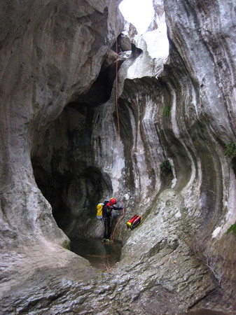 Dates : 19/04/19-30/04/19 (désolé d’avoir tardé autant à poster le compte rendu)Organisatrice : AnnaParticipants : Anna, Philippe et Félix pour toute la durée, Thomas (surtout canyoneur) et Nicoleta rejoignent en cours de camp.Hébergement: Hotel Ghivine Albergo Diffuso: Via Roma, 36, 08022 Dorgali, Italy Photos : AnnaTexte : Félix et Anna (auteur marqué par une étoile (*)Jour 1 : Vendredi 19/04/19 (vendredi de Pâques)Anna + Philippe + Félix* : Trajet en train jusqu’à l’Aéroport de Genève, puis vol jusqu’à Olbia en Sardaigne. A l’arrivée à Olbia, on récupère nos valises, mais celle d’Anna est cassée (coin avec roue à moitié arraché). Longues discussions pour faire la réclamation (au final elle recevra une nouvelle valise … livrée chez elle dans quelques semaines), puis attente pour récupérer la voiture de location, puis rouler jusqu’à l’hôtel où on arrive un peu avant minuit.Jour 2 : Samedi 20/04/2019Anna + Philippe + Félix* : On décide de commencer par une grotte facile et horizontale : Su Crabargiu. On a la topo et les coordonnées GPS de l’entrée : à priori rien de compliqué. On regarde sur OSMAnd (carte basée sur OpenStreetMaps), et la cavité semble située sur une pente un peu raide mais rien de trop compliqué.L’accès semble bien plus facile par le haut, où on peut faire le plus gros du chemin avec des chemins balisés et où on a bien moins de dénivelé. Arrivé sur place, mauvaise surprise : la pente qu’on avait vu sur la carte est en fait une falaise de 100-200m de haut sur plusieurs kilomètres de long, sans la moindre brèche à descendre facilement. Il semblerait que les courbes de niveau d’OSMAnd sont basées sur des mesures radar depuis des satellites, et qu’entre les points de mesure, la courbe est juste interpolée (lissée) : du coup, avec un point de mesure en haut de la falaise et un autre un peu plus loin en bas, on se retrouve avec une pente au lieu d’une falaise abrupte. On passe plus de 2 heures à arpenter le haut de la falaise pour essayer de repérer l’entrée « visible de loin », désescaladant à plusieurs endroits quand ce n’est pas trop dangereux. D’après des informations obtenues plus tard, l’entrée serait sur une espèce de vire, dans la falaise, et l’accès se fait par le coté. Bref, si vous voulez visitez la grotte, faites vous accompagner par quelqu’un qui connaît le chemin !Jour 3 : Dimanche 21/04/2019Philippe : ballade et visite d’une « tombe des géants »Anna+Félix* : visite de la grotte SA RUTT’E S’EDERA.La grotte commence par une zone de puits.