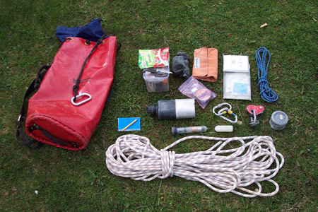 Ce qu’il faut toujours avoir dans le kit du chef de course.Le 1er jour de cours est consacré à la dynamique de groupe et à la préparation de la sortie. Savoir accueillir les participants et se poser les bonnes questions pour préparer la virée sous terre sont des choses essentielles.A la fin de la journée, direction le hammam et le jacuzzi pour se détendre un peu.Le 2e jour, départ à 8H pour le Touki-trou sur la commune des Pommerats. Cette cavité est souvent utilisée comme grotte d’initiation par les spéléos jurassiens. Les néophytes auront 3 puits à passer (2,5, 7 et 8m). Nous PX équipe le 1er puits, Laure le 2e – en sortie de méandre – et je m’occupe de mettre en place la vire au-dessus du dernier puits pendant que les autres remontent accueillir leurs stagiaires.