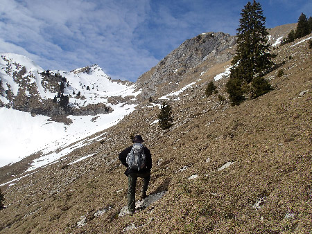 Par ce beau matin de printemps nous décidons de tenter notre chance pour aller prospecter sur le versant Est de la Dent de Lys qui semble dégagé car depuis la vallée on voit qu’il y a trop de neige ailleurs.Parking obligatoire aux Sciernes d’Albeuve car la route plus haut est trop enneigée, puis montée jusqu’au chalet de Cuvigné en passant dans les pentes raides par le Gouffre de la Grosse Frasse. De là, nous gagnons ensuite la partie supérieure de la combe de Chéveresse.Partie supérieure de la combe de Chéveresse. Le lapiaz entre la Dent de Lys et le Gros Sex est encore bien enneigé.
