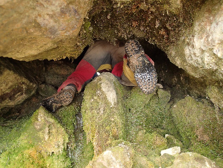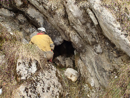 Une trentaine de chamois passant 150 m au dessus de nos têtes, nous restons donc un moment à l’abri des chutes de pierres, puis nous pouvons enfin explorer et topographier une petite cavité (CU2).Entrée du CU2 (Grotte des Crampes). C’est une émergence qui s’ouvre dans les calcaires plaquetés du Néocomien.