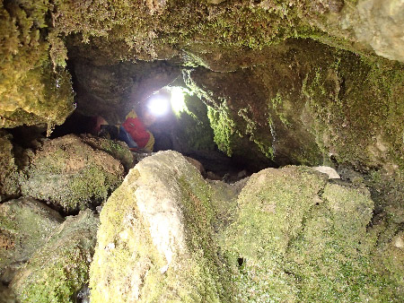 Après ça s’agrandit un tout petit peu, mais à seulement 7 m de l’entrée un gros bloc obstrue le conduit. A revoir en détruisant ce bloc car derrière il semblerait qu’il y ait une suite.