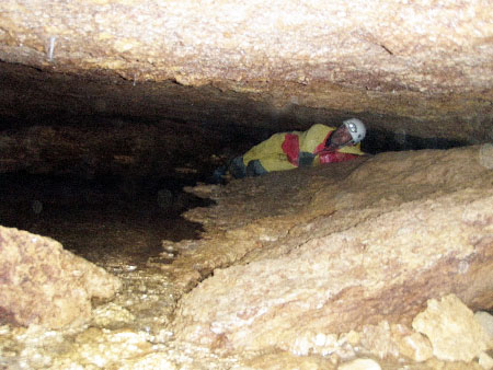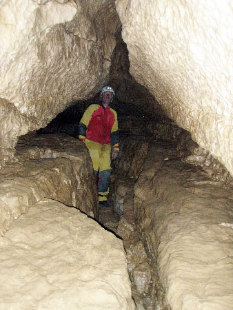 La suite est plus spacieuse mais avec encore quelques passages bas. On retiendra surtout l’étonnant plafond formant une dalle bien lisse car cette cavité se développe sur un joint.