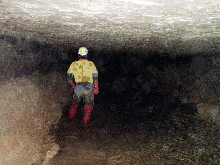 Après le couloir spacieux de l’entrée il faut franchir un laminoir où on se rend vite compte que l’eau est vraiment très fraiche. Sur la première partie on se mouille à peine, mais les derniers mètres se feront le nez dans l’eau.
