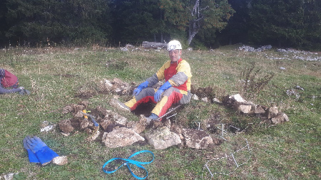 Cette diaclase, connue depuis longtemps, se trouve dans le pâturage en bordure du lapiaz du Petit-Pré. Elle était impénétrable mais intriguait beaucoup de monde, alors nous avons décidé de faire sa désobstruction.