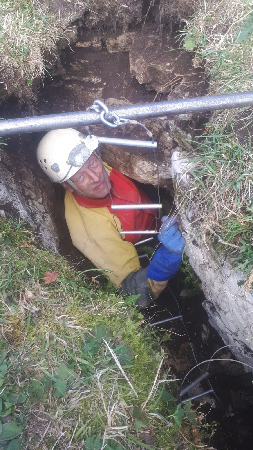 Malheureusement, ce n’est pas ici qu’il y aura une jonction avec le Gouffre du Petit-Pré, car elle se termine à 3,5 m de profondeur. Après avoir levé la topo, l’orifice sera rebouché avec des pierres et des branches pour éviter un accident avec le bétail.Photos : Marc