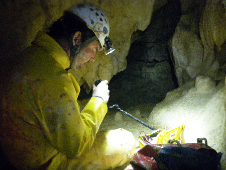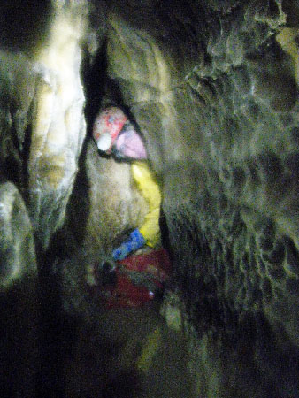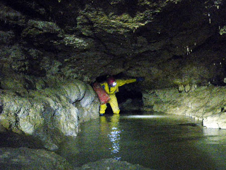 Le but de cette journée est de faire un repérage en surface avec des Barryvox pour situer exactement la position de la Salle de la Crypte située au fond de la Galerie Parkinson dans le Réseau des Fées.Vers 10h, Laure, Vivien et Patrick partent donc sous terre et après quelques hésitations sur le cheminement dans la Rivière Blizzard atteignent enfin cette petite salle, bien mouillé car malgré la sécheresse il y a pas mal d’eau sur le trajet (le mouille-nuque est d’ailleurs plein).Peu d’eau dans ce passage, mais la Blizzard et Parkinson seront nettement plus humide (photo : Laure)