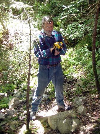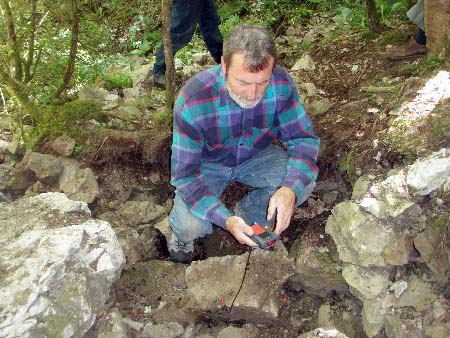 Les radios Nicola sont alors mises en service afin de coordonner le travail entre les équipes souterraines et de surface, puis l’équipe de surface commence ses recherches avec les Barryvox.Malheureusement aucun signal vraiment clair ne sera perçu (en plus il fallait faire attention car lors des émissions avec les Nicola il y avait pas mal de perturbations sur les Barryvox).Le barryvox est muet ! (photo : Jack)