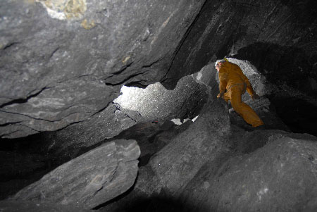Après quoi, nous nous mettons au travail dans l’effondrement qui peut se contourner par des passages entre les immenses blocs et terminons la topographie dans la partie derrière l’effondrement.A travers l’énorme effondrement