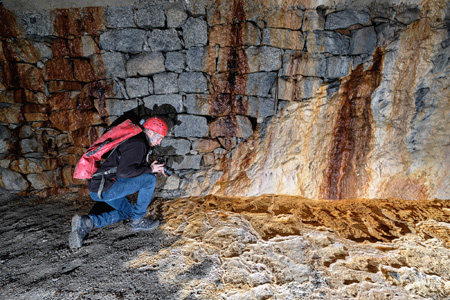 Tout au long de la galerie, il y a des vestiges de l’époque (morceaux de métal. clé à fourche, etc.), mais on ignore encore quand et pourquoi cette galerie a été creusée (pierre à chaux comme la Carrière Souterraine de Malévoz ?). Photos : JackAprès un pic-nic, nous nous rendons ensuite à la Carrière Souterraine de Malévoz qui a été topographiée en 2014 par le GSL, mais cette fois en entrant par l’entrée de la Galerie Médiane qui se trouve en falaise, car l’entrée supérieure a été condamnée par une chape en béton lors de la construction du domaine immobilier situé en dessus de cette carrière.Michaël sur le tapis roulant qui sort de l’entrée de la Galerie Médiane en falaise et qui domine le vide (photo : Jonas)Depuis 10 ans, il n’y pas eu beaucoup de changement dans cette galerie médiane où l’on trouve tout au long un tapis roulant et dont le terminus est toujours encombré par de gros vestiges métalliques.Vers le terminus de la Galerie Médiane (photo : Guillaume)