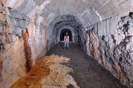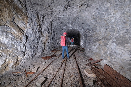 La galerie se poursuit ensuite avec un sol de sédiments, puis de cailloutis où se trouve une voie Decauville qui peu après de divise en deux au niveau d’un aiguillage. Finalement, les deux voies parallèles butent sur un cul-de-sac total à 61 m de l’entrée.
