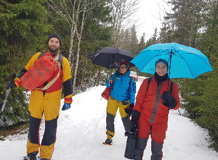 Petite sortie pour faire découvrir le monde souterrain à Marc et Federica, et, à cette période de l’année, quoi de plus normal que d’aller à la Grande Rolaz.Rendez-vous pris pour 13h, nous voilà arrivés au Col du Marchairuz sous une petite bruine qui n’a pas l’air de faiblir. Nous nous changeons sous la pluie… voilà, nous sommes déjà trempés, donc on ne craint plus rien. Néanmoins, certaines d’entre nous (je ne donnerai pas de noms, n’est-ce pas Anna ?) prennent quand même le parapluie… image oblige. Nous avions prévu des raquettes de neige, qui s’avèrent être bien utiles, car la neige est assez abondante sur ce versant du Jura.
