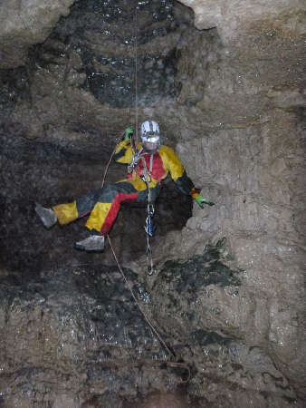 Nous profitons pour visiter les différentes salles et nous nous attardons dans la grande salle, où nous profitons pour faire des exercices de montée et descente sur corde jusqu’au balcon et visiter les galeries basses derrière. Nous redescendons dans la grande salle et nous dégustons, dans la bonne humeur, un succulent Panettone, qui, malgré qu’il soit devenu carré lors de la descente dans la grotte, il n’a rien perdu de sa saveur. Merci Federica d’avoir pensé à ce bon goûté. Du thé chaud agrémente le tout et nous réchauffe un peu.Dans les boyaux latéraux