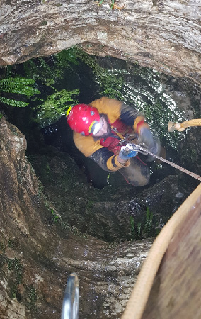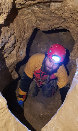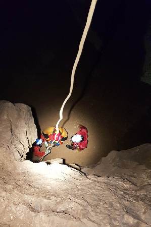 Grâce au flair de Philippe, nous tombons tout de suite sur l’entrée de la grotte, qu’Anna commence à équiper pendant que Nicoleta aide les nouveaux spéléos à se dépatouiller dans la quincaillerie. Nous sommes tous passés, au début de l’apprentissage des techniques verticales, par ce moment où nous nous demandons « comment diable vais-je faire pour me souvenir comment mettre tous ce matos ! »Voilà que nous sommes tous prêts. Philippe ouvre la descente. Marc et Federica suivent comme s’ils avaient fait ça toute leur vie !