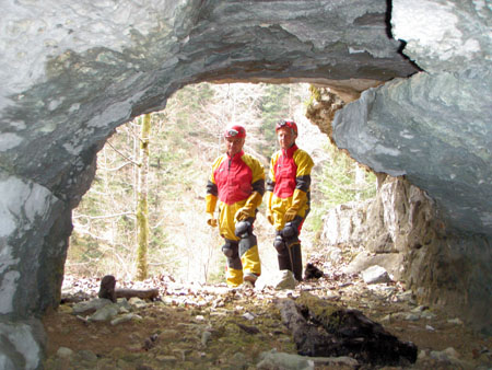 Après une marche d’approche en rive droite des gorges, nous redescendons et gagnons finalement l’entrée en empruntant la rive gauche.Le porche bien visible depuis la rive gauche des gorges