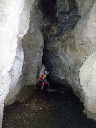 En quittant cette galerie, le couloir pentu qui mène à la rivière confirme notre pressentiment car on entend déjà le mugissement de l’eau. Pas de doute, le débit est vraiment important. En effet, l’aval siphonne et en amont on visite un petit bout avant d’abandonner car ensuite il y a trop d’eau et ça siphonne à la première voûte mouillante.Début de la rivière. Ici le niveau encore bas, mais ensuite ça change !