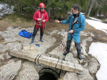 Pour la sortie d’initiation de Marion, nous avons choisi la Grotte de la Grande-Rolaz, petite cavité proche du col du Marchairuz. Arrivés sur le parking au départ du chemin vers la grotte, le vent souffle fort et il y a même quelques gouttes qui tombent.Avec les coordonnées GPS de l’entrée de la cavité, nous avons vite trouvé la grotte. Avant de commencer notre visite, nous avons profité de quelques rayons de soleil pour prendre le déjeuner ..