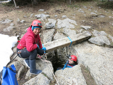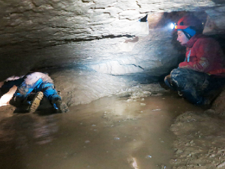 Au fond de la galerie Sud-Ouest, nous profitons pour explorer des passages pas trop larges, et de permettre ainsi à Marion de se familiariser avec les tout petits volumes.Nous avons laissé pour la fin la visite de la Galerie de la Boue. Avec un tel nom, aucun d’entre nous ne s’attendait à ce que la galerie soit sèche et les parois tout blanches. Après une petite salle où une échelle était posée par terre pour faciliter le passage dans la boue, et un passage bien étroit, nous arrivons dans une salle dans laquelle nous pataugions dans la boue. Après une petite exploration de cette salle, Eric décide d’aller jusqu’à la galerie des Laminoirs ainsi qu’au balcon. Comme il aurait fallu s’allonger dans la boue pour passer, Marion et moi avons décidé de faire demi-tour et retrouver Eric dans la Salle avec le balcon. Nous avons eu une petite frayeur lorsque nous n’arrivions plus à retrouver la sortie de la galerie de la Boue, qui était bien cachée un peu en hauteur, derrière un grand rocher.