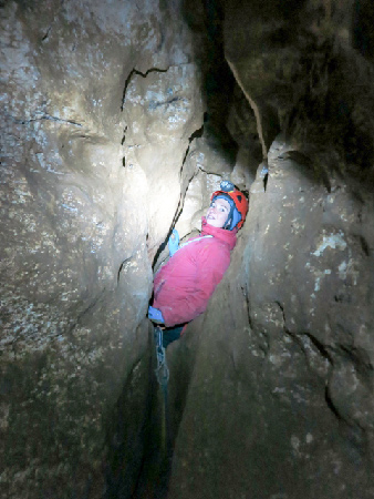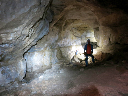 Après un très joli puits d’entrée de 7 m, nous arrivons dans une grande salle d’où partent 3 galeries. Nous sommes étonnés par les grands volumes des galeries Nord-Est et Sud-Ouest.