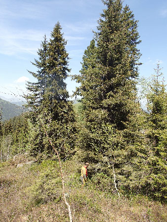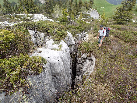 Plusieurs cavités sont revues ou inventoriées dans la partie inférieure de cette zone où plus on descend, plus la végétation devient envahissante. Dans le C32, la topographie doit malheureusement être remise à une autre fois car le boyau menant au P20 est obstrué par une coulée de glace.Dans la partie basse de la zone, il faut bien chercher les orifices comme ici où un puits s’ouvre au beau milieu des sapins.
