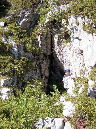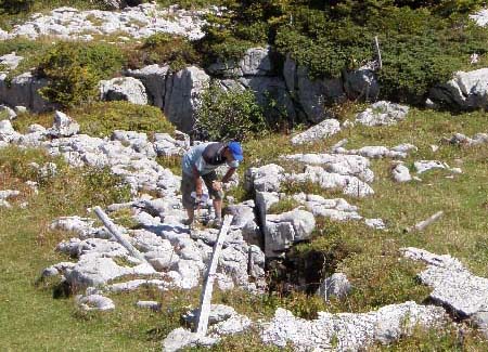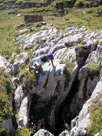 Nous profitons aussi pour aller jeter un coup d’œil aux trois seules cavités vraiment polluées sur ce karst, car situées non loin d’un chalet d’alpage. La situation ne s’est pas améliorée depuis 15-20 ans et l’odeur infecte ressentie au sommet du puits d’entrée nous dissuade d’y descendre !!! Le B19, une des trois cavités très polluée sur le karst
