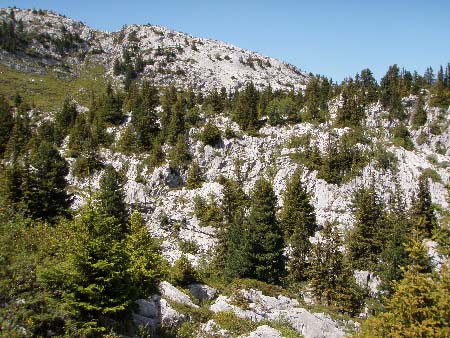 Quant à la suite de la prospection, principalement dans la partie marquant la limite entre les deux zones, elle nous permet de trouver trois nouvelles cavités ainsi qu’une cavité avec un ancien marquage SCM 84 … initiales déjà entrevues sur la zone D mais dont nous ignorons la signification.Paysage sur la limite entre les zones B et C