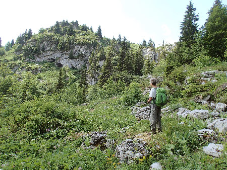 Prospection sur la partie basse du lapiaz des Cases d’Aveneyre dans une chaleur étouffante. Cette année, à cause de la chaleur et des nombreux orages, la densité de la végétation est impressionnante ce qui ne facilite pas la progression et rend une partie du lapiaz quasi inaccessible. Deux fractures semblent intéressantes et sont à revoir ultérieurement.Sur un replat dégagé du lapiaz (avec vue sur les grottes aux ours) avant de s’enfoncer dans la végétation