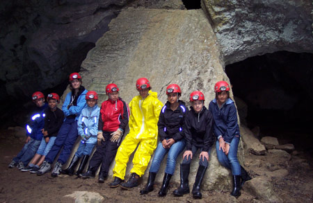 A l’entrée de la grotte, devant le rocher à Jean-Jacques RousseauBref, une fois les enfants casqués, nous montons vers la cascade à côté de laquelle s’ouvre la grotte. Le temps d’immortaliser l’instant – celui où ils sont encore propres – et nous pénétrons dans la montagne pour découvrir un monde que peu connaissent. A l’entrée de la 2e galerie, un lac pose un premier problème à ceux qui ne sont pas bottés; ce n’est que le début, la boue viendra ajouter à la difficulté. On en profite pour faire une 2e photo alors qu’ils ne sont pas encore trop crottés.