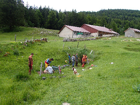 Après une soirée (Michel et Eric) pour détruire les deux gros blocs qui se trouvaient au fond du trou, cette journée est consacrée à la sortie des déblais. Comme nous n’avons pas de 4×4, impossible de descendre avec la remorque prévue vers l’entrée alors les cailloux sont utilisés pour refaire le mur à proximité.Le fond du boyau est aussi agrandi et en fin de journée un petit orifice permet de voir enfin un élargissement.Encore bien du monde pour cette journée