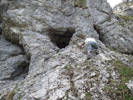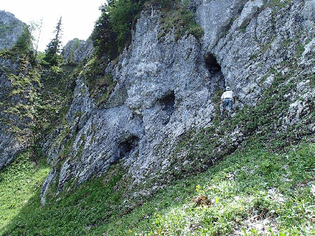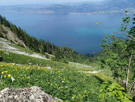 Il y a quelques années, Alex et Maric avaient repérés de loin des porches à la base de la Pointe de Chaumény (commune de St-Gingolph, Valais), mais nous n’avions jamais eu le temps d’y aller.Pour y accéder nous partons depuis Le Bouveret et après un petit bout de chemin, c’est parti pour une longue montée de 900 m de dénivellation dont 400 m hors sentier dans une combe très raide composée d’éboulis encombré de végétation dans sa partie basse.Belle vue sur le Lac Léman depuis le haut de la combe d’accès