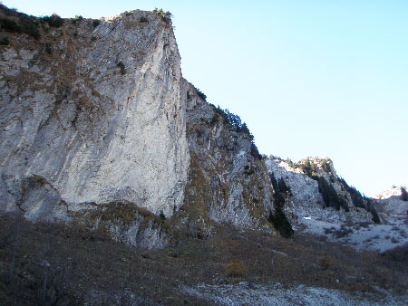 Je passe ensuite dans la combe des Clous et retrouve malheureusement plus d’ombre que de soleil, mais ici il n’y a pas de plaques de neige.Au pied des falaises dans la combe des Clous