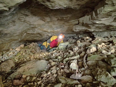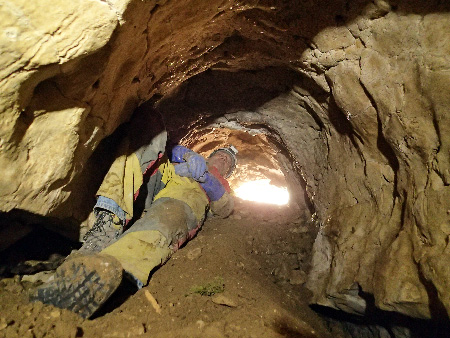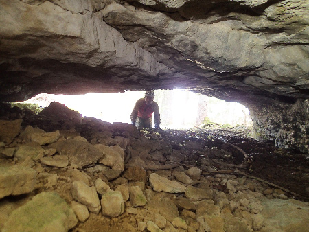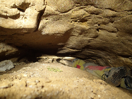 Dans une combe du Bois de Ramelet, nous topographions ensuite une deuxième cavité. L’orifice est minuscule mais derrière il y a un petit couloir en forme de conduite forcée au sol remplis de terre, puis le remplissage devient plus important et il faut à nouveau passer à plat ventre. Arrêt sur obstruction sans espoir de suite.