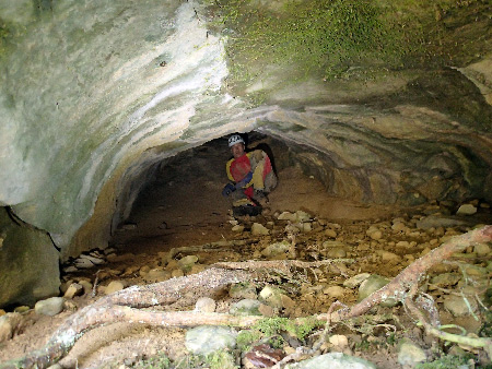 Toujours dans le Bois de Ramelet, nous topographions une troisième cavité d’où sort un petit ruisselet. Joli profil de galerie, mais malheureusement ça queute à 7 m de l’entrée sur un bouchon de calcite.