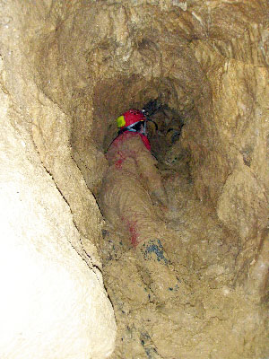 Enfin, Corinne, Hervé et Patrick commencent la désobstruction du fond dans une ambiance … très argileuse. Le groupe électrogène et le perfo ne seront finalement pas utilisés car il faudra faire parler la poudre.Le boyau terminal (photo : Marc)